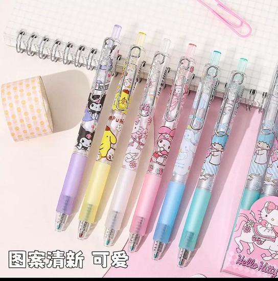 Cada canetinha possui tinta à base de água, com secagem rápida e volume suficiente para garantir um uso prolongado sem borrar. O kit acompanha várias unidades, permitindo uma variedade de cores para desenhos e escritas coloridas. As canetinhas apresentam um corpo translúcido com estampas do universo Hello Kitty, facilitando a identificação da cor.